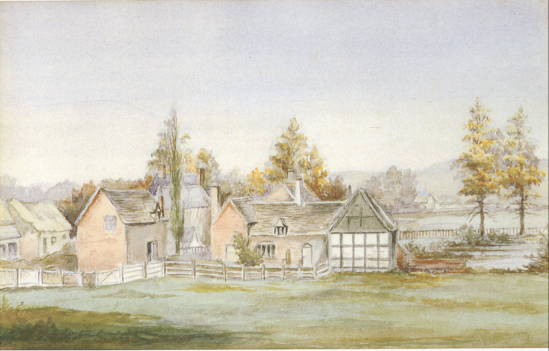 ![]() The watercolour painting of Sandford “Old farm &c. on Sandford Fields now known as the Murvagh Ground facing Christowe and Newick House.” “Copied by Miss Marklove 1897, from a sketch by Miss L Bingham, from window at Christowe, 1867.” This painting is the only known chance we get to view the heart of Sandford. The original watercolour painting at one time hung on the wall (1979) in the Old Cheltonians Office in Cheltenham College. It was drawn circa 1860 and depicts the settlement from the south. It shows a settlement with a bewildering number of houses and farm buildings, but if one studies the Merrett’s map of 1834, one can identify most of the buildings illustrated. The house in the foreground is Sandford cottage. It has what appear to be two wings of differing style. The east wing is possibly an attached timber-framed barn with a cesspool and pond by its side. The roofline of the farmhouse can be seen behind the cottage. To the west of the cottage and in the foreground are various outbuildings, at least one appearing to be thatched. The steep-roofed structure with tall chimneys in the background is ‘Gothic Cottage’, the short-lived successor to the Great House. In the distance beyond the cesspool is a building that does not appear on any town map. It may be artists' licence and may depict Bellevue Farm or even the Mill, or it could just depict a house across the fields on what is now London Road.