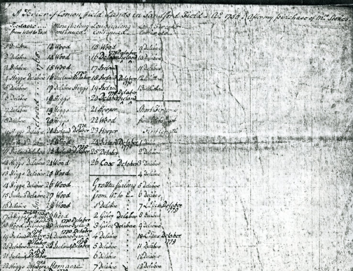 Below is a transcription of a terrier relating to Sandford in the possession of Mr Baldwin of Charlton Kings. This invaluable document was probably part of the 'De la Bere papers. The document relates to 4 fields of Sandford: Redacre, Morefurlong, Longfurlong, fields that are depicted on the above plan. A terrier is a document that records the apportionment of land between different owners or tenants. In this instance the terrier records the ownership of the 153 strips that went to make up seven open fields. The terrier presents a picture of rapid change to the land. Large blocks of land were coming under single ownership. By 1756 the De la Bere family is the majority landowner and later additions show the old Sandford families of Higgs & Ireland selling out to the De la Bere estate. The Wood's being the owners of the Sandford estate appear to continue their ownership until they sold the estate in the early nineteenth century. Where there are two names against a particular strip it indicates that the strip has been sub-divided. The terrier also records the direction in which the strips lay, an example being the strips in 'Redacre' were counted "from west to east", therefore indicating that the strips ran north-south. |
