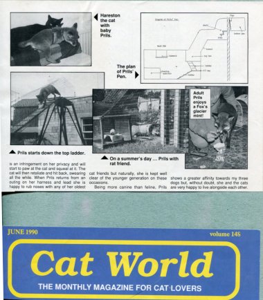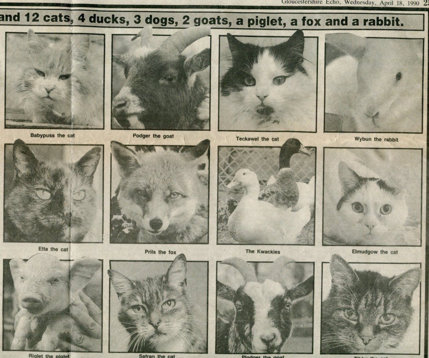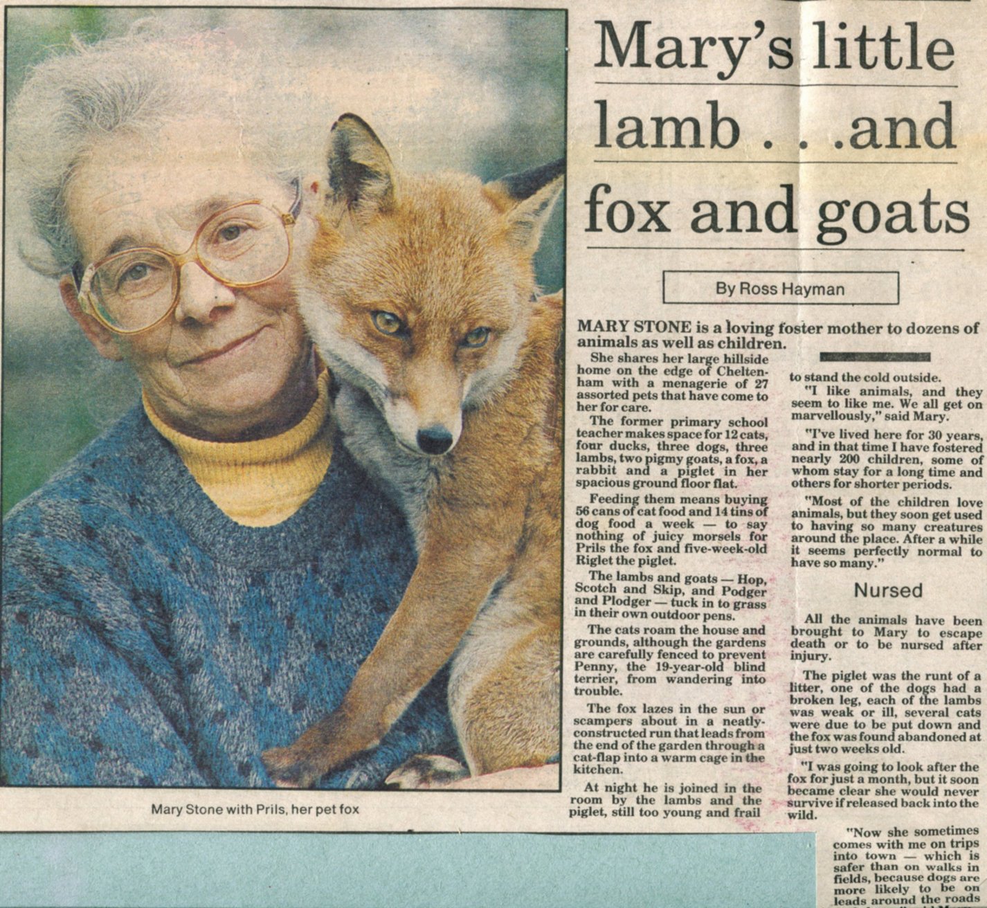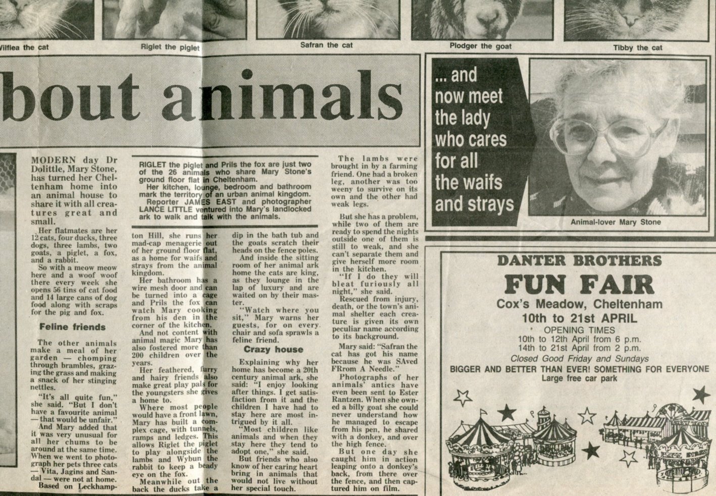 In the Gloucestershire Echo of 18 April 1990, there is a centre-page spread dedicated to Stoney and her 21 animals. Over the years Stoney was featured in a number of magazine articles and photos in various magazines. Other creatures included rabbits, rats, guinea pigs, chinchillas, mice, gerbils, mostly looked after as rescue animals or on short stay from friends, in essence, an animal sanctuary.