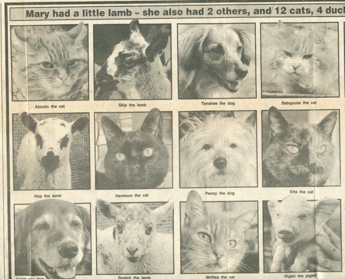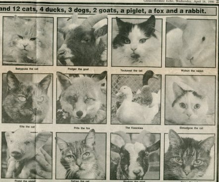 The 18 April 1990 article: The dog on the bottom left of the first sheet is Coret. The goat on second sheet is Plodger and the cat at the bottom right is Tibby.