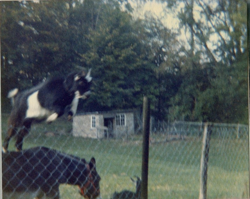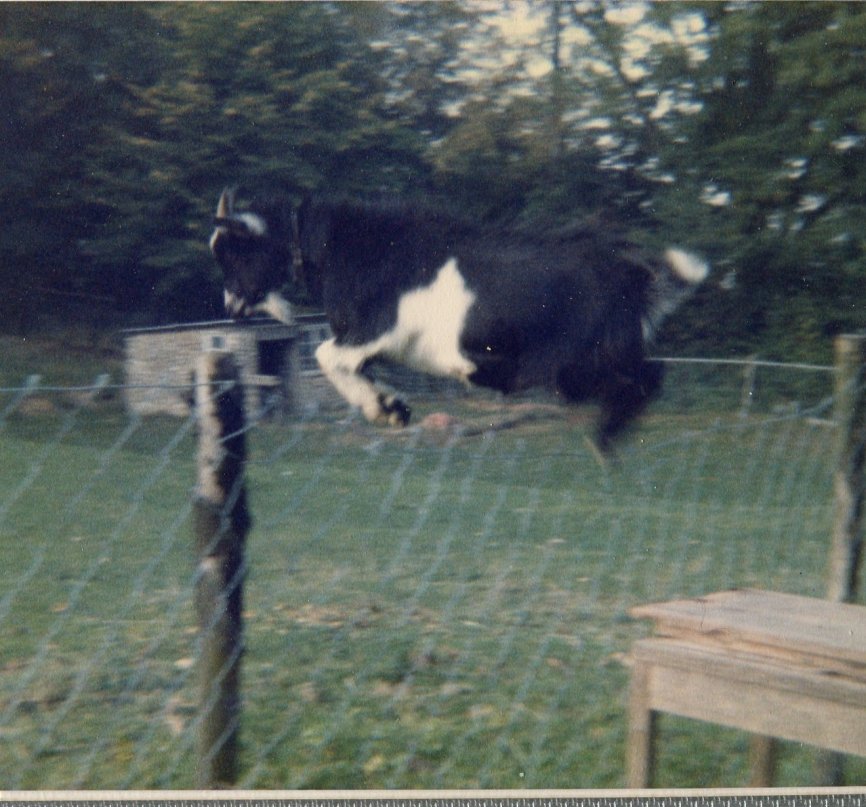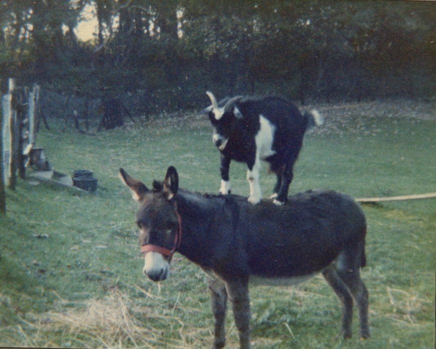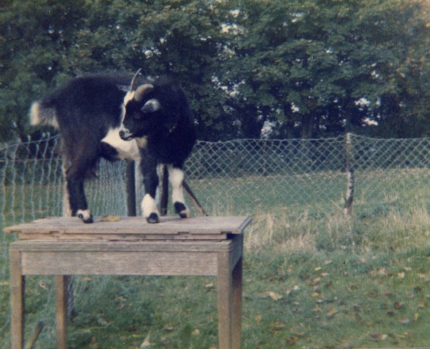 Stoney had several goats over the years, initially to keep the donkey company. They included two pigmy goats. One of them was quite adventurous and on numerous occasions escaped the corral below the back lawn by jumping on the donkey's back so that it could leap the fence! So Stoney built a table to go on the outside so that it could jump back in.