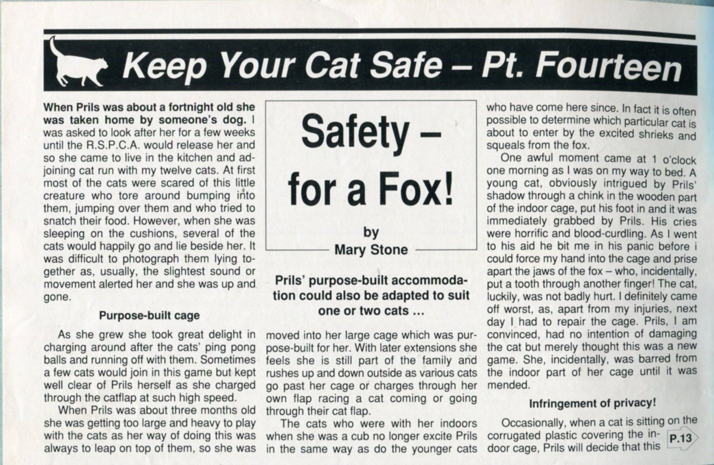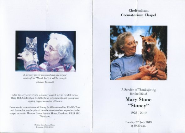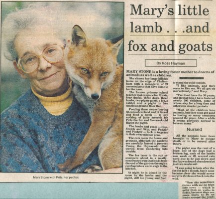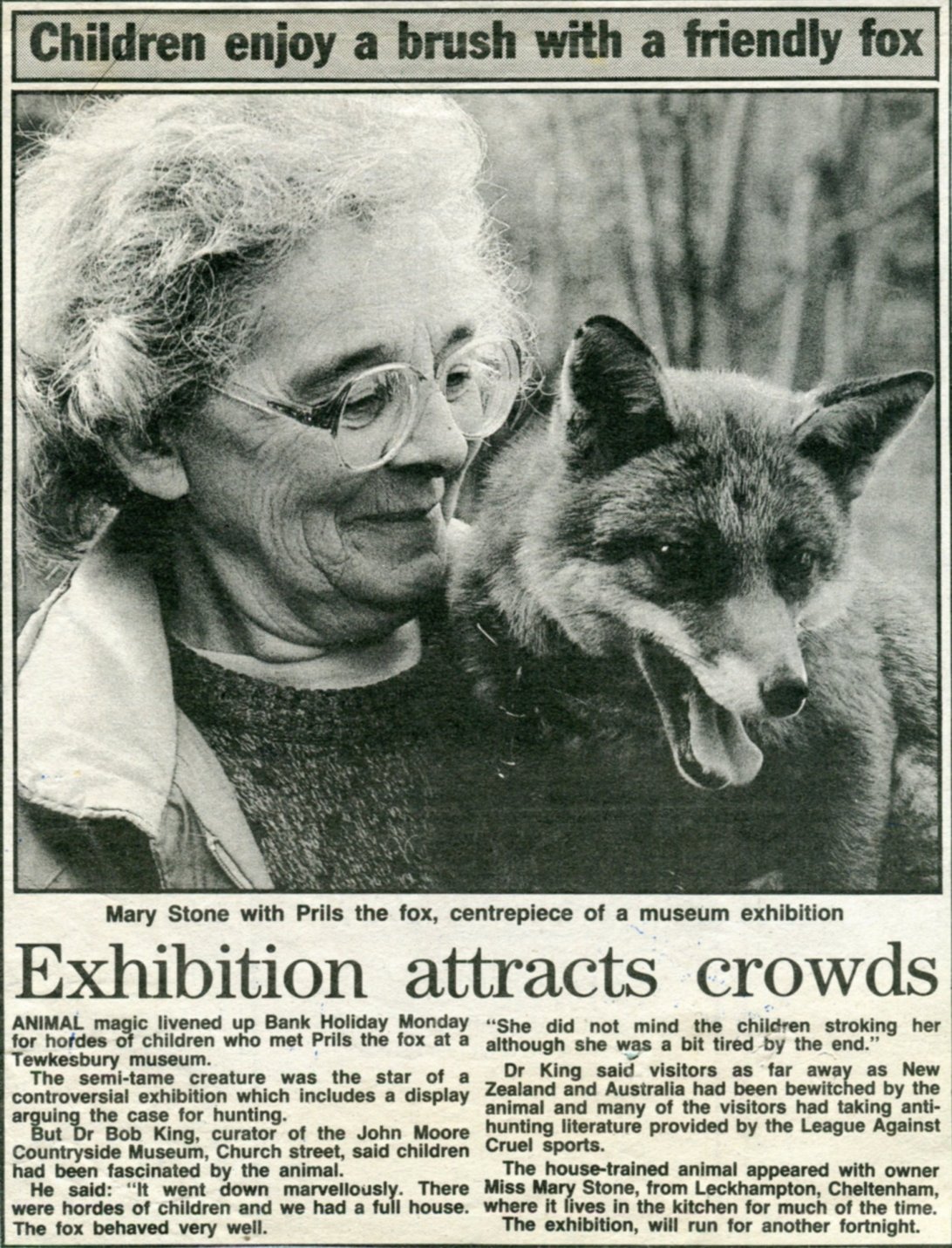 A major animal of her life was the fox Prils, which came from a friend, the late Patti Newbury. Patti worked in a vets and lived in Ryeworth Lane, Charlton Kings, where she looked after injured birds, mostly owls. A dog had brought home a small fox cub which then ended up at Patti's house to be looked after. She asked Stoney to have her for a month. This was before wildlife centres were established. Prils lived for 14 years, a great age for a fox. When still young, Stoney would carry her around town and to events to get her accustomed to people.