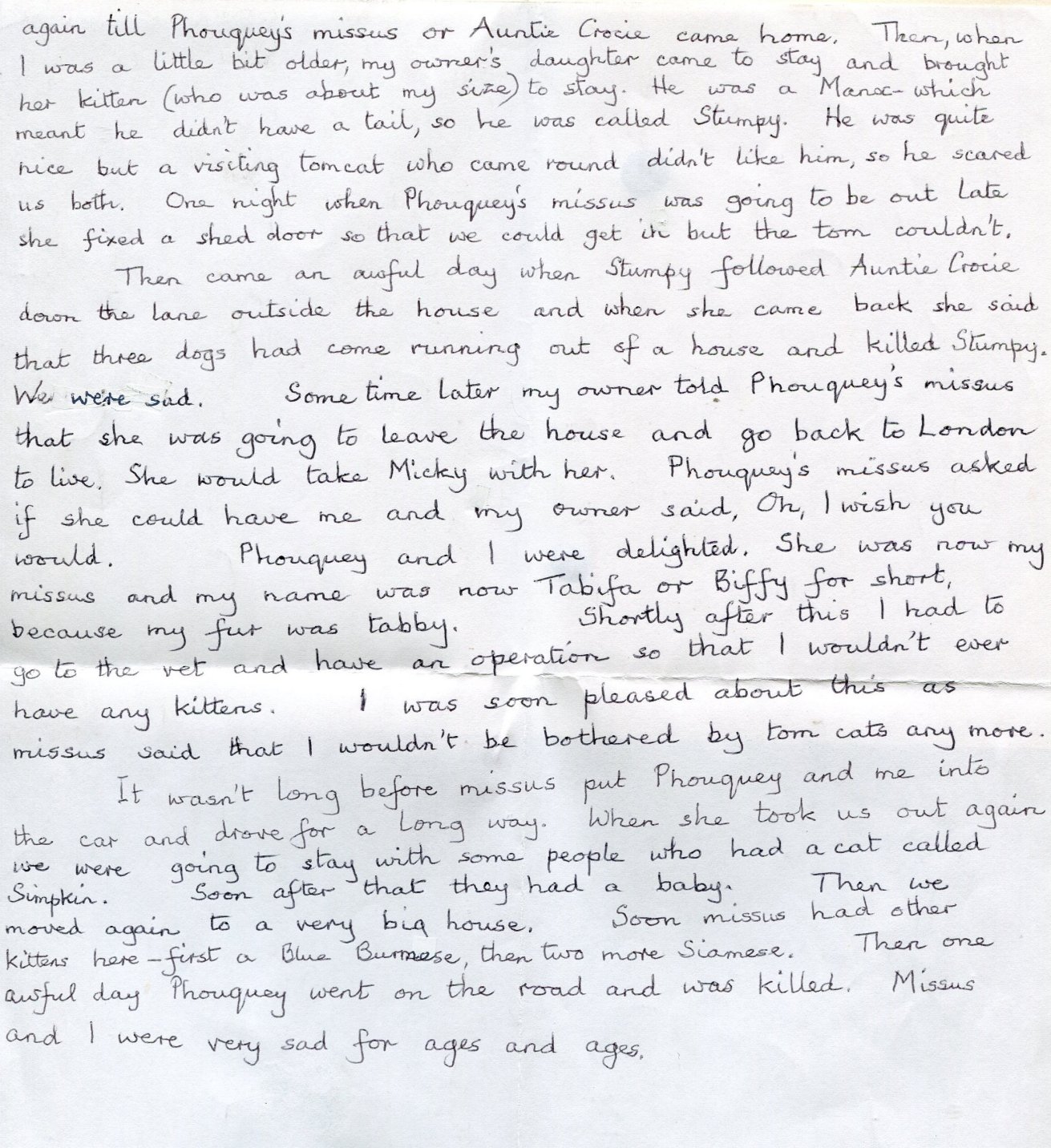 Another unusual characteristic of Stoney was her talking, and writing cats and dogs. Back in the mid 1950's while in her flat in Aldershot she wrote a story as if written by her cat Phouquey, called 'I Phouquey'.