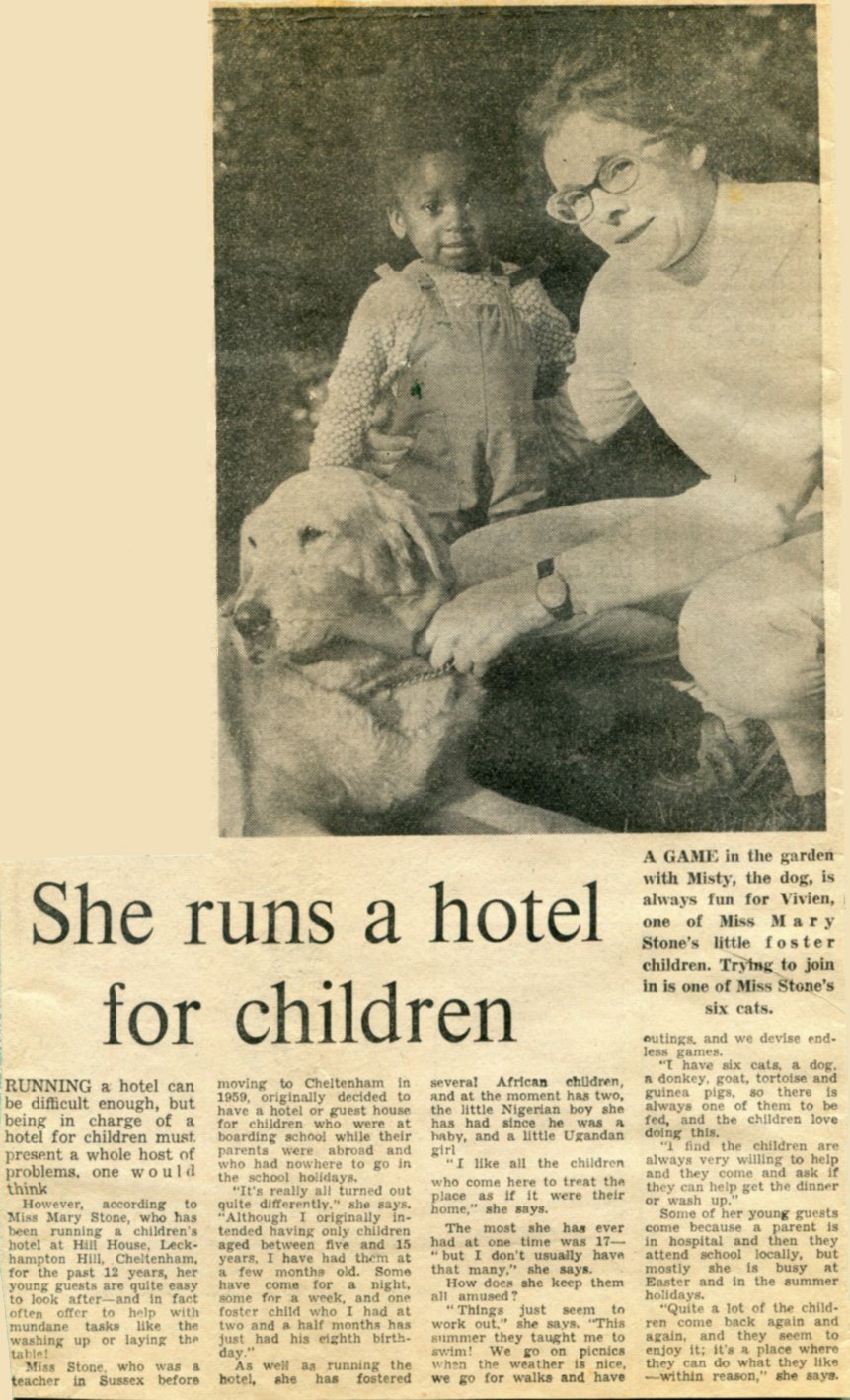 Stoney also answered adverts in 'The Nursery World' and acquired younger children, mostly from Africa, whose parents were studying in this country. Two baby boys came within a week, Dele from Nigeria aged 3 months, and two days later she went to London to collect Philip from Sierra Leone aged 2½ months. Eighteen months later she took Dele to London for his brother's christening and was told that she could also take him, he was called Akin. Three years later along came 3 year old Jackie, from Uganda. Jackie grew up at Hill House and now lives and works in Luxembourg. Jackie, along with all the children, went to school at Leckhampton Primary School. Amongst Jackie's friends was a Jackie Roberts who lived in Daisybank Lane just where it turns into a dirt road. Another little girl called Caroline, came via Jackie's uncle, a dentist in London.